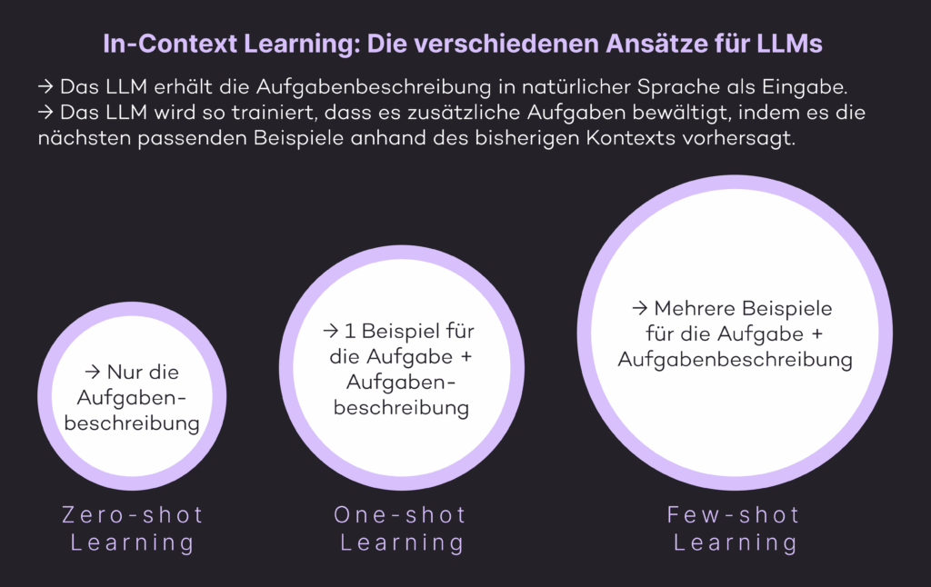 Zero-Shot-, One-Shot- und Few-Shot-Learning sind Methoden des In-Context-Learnings. Dabei passt sich das Modell über natürliche Sprachinstruktionen und Beispiele im Prompt an eine Aufgabe an, ohne dass die Gewichte verändert werden. Beim Fine-Tuning hingegen werden die Modellparameter anhand eines überwachten Datensatzes durch Gradienten-Updates angepasst, was zu dauerhaften Veränderungen im Verhalten des Modells führt.